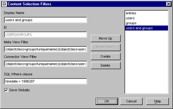 Content selection filters can be created or modified using this option. The entries added or edited in this window affect the selections available in the Query Tool Content Selection Filters drop-down list ("Find all"). The filters are used against the data in the entries of the context view (cn, sn, Location, Phonenumber, etc.).