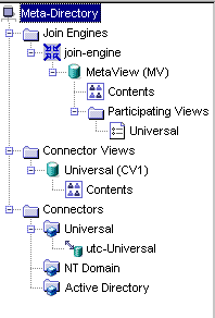 Figure 3-1 shows how the Meta-Directory navigation tree appears if you were to create a Universal connector and its corresponding connector view, then enabled it as a participating view.