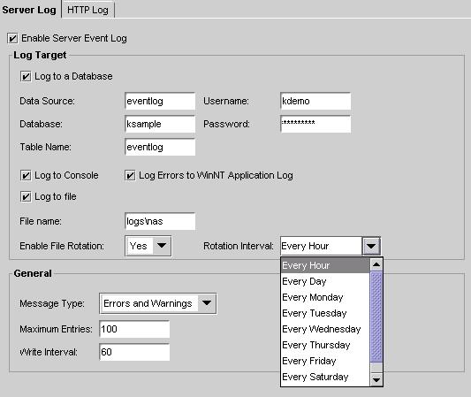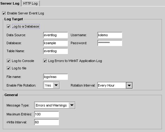 3. In the Log Target box, choose the type of logging to enable by clicking the Log to a Database, Log to Windows NT Application Log (Errors Only), and/or Log to File checkbox(es). You can disable console logging by deselecting the Log to Console checkbox.