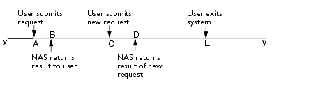 In the following diagram, think of the horizontal line (points x to y) as system activity. A single user is a concurrent user from point A until point E. From points A to B the user's request is being processed by the system.