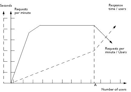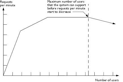 In any system, as the number of concurrent users rises, so does the number of requests per minute (or per second). Then, at a certain point, although more users are concurrently on the system submitting requests, the number of requests per minute starts to level off and remain constant, as the following diagram illustrates: