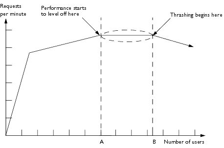 Point A represents the maximum number of concurrent users the system can handle before requests per minute start to level off. Point B represents peak capacitythe maximum number of users the system can support before performance starts to degrade. (Note that peak load is not represented in the diagram because it is not a function of the NAS performance curve, but rather a value defined by your system requirements.) Eventually, requests per minute start to decline, even though the number of concurrent users continues to rise. As the diagram above illustrates, this results in multiple users on the system but fewer requests being processed, a situation referred to as "thrashing." Thrashing occurs when the system is spending more time and resources managing queues and loads than actually processing requests.