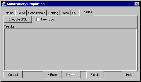 Click Finish if you are satisfied with the test results; otherwise, continue to edit the associated query SQL until you obtain the correct results. If Netscape Application Builder cannot parse your SQL, all other query editing tabs are disabled except the SQL and Results tabs.