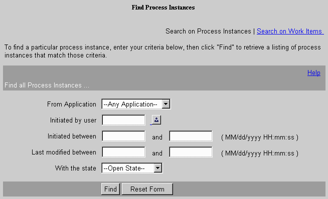 You can enter search criteria for process instances (for details, see the next section, Finding Process Instances):