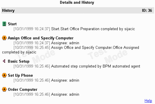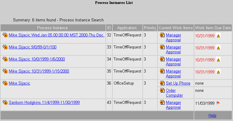 Process Instance: The name of the process instance, such as Joe's Timeoff Request. This name is a link to the Display Process Instance page for that process instance. (For details, see the next section, Administering a Process Instance.)