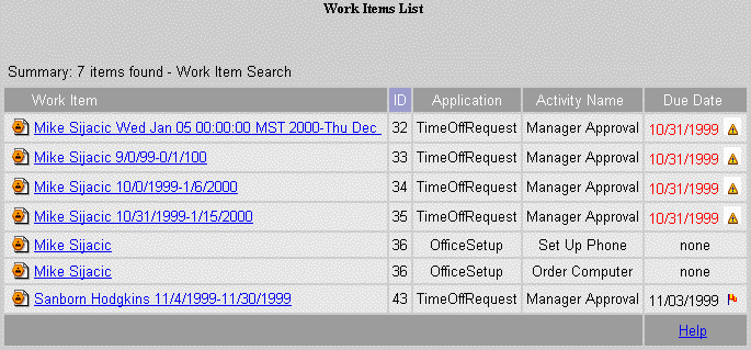 Work Item: The name of the work item. This name is a link to the Display a Work Item page for that work item. (For details, see the next section, Administering a Work Item.)