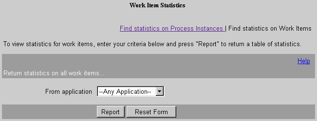 Obtaining Work Item Statistics When you click the Statistics tab and then the Find Statistics on Work Items link, the Work Item Statistics page is displayed. You use this page to request a statistics report for all work items for one or all applications that are initiated or modified within a given time period.