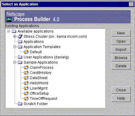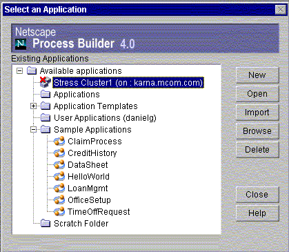 Takes you to the "Select an Application" dialog box, from which you can delete an application. If an application is already open, Process Builder closes the application. If the open application has unsaved changes, you are first prompted to save the application.