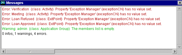 The Messages window is where error, warning, and information messages are displayed when you check the application syntax using the Check button. The syntax is also checked automatically when you attempt to deploy an application.