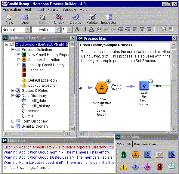 Figure 1.3 shows a sample view of Process Builder when you open an existing application (the CreditHistory application in this case).