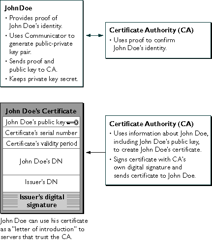 The CA's digital signature allows John Doe to use the certificate as a "letter of introduction" to servers that trust the CA. The CA's signature is obtained by encrypting a one-way hash of John Doe's certificate with the CA's private key. For more details about the way a digital signature is created, see Digital Signatures.