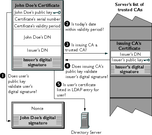 - Does the user's public key validate the user's digital signature? The server checks that the user's digital signature can be validated with the public key in the certificate. If so, the server has established that the public key asserted to belong to John Doe matches the private key used to create the signature and that the nonce has not been tampered with since it was signed.