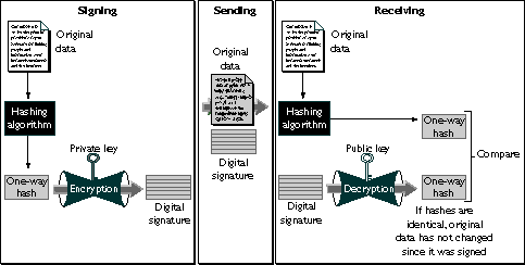 If the two hashes match, the recipient can be certain that the public key in the signer's certificate corresponds to the signer's private key. To confirm the identity of the signer, however, also involves confirming the validity of the digital signature of the CA who issued the signer's certificate. For a discussion of the way this works, see Authenticating a User's Identity.