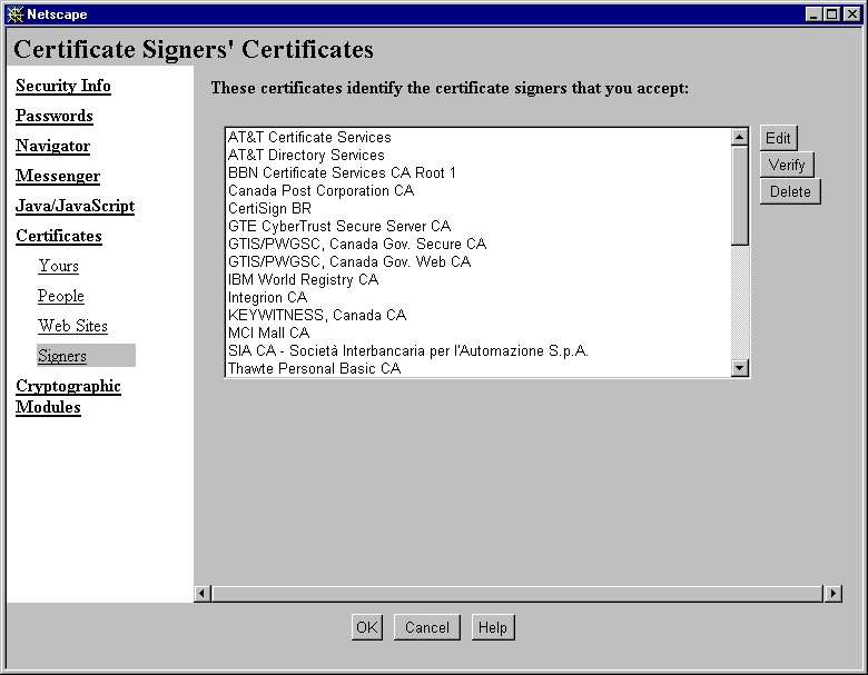 Communicator's list of certificate signers is just a collection of CA certificates--that is, certificates issued by CAs for the purpose of identifying themselves. You can select a CA and use the Edit button to control the kind of certificates (such as SSL or email) certified by that CA that you are willing to accept. You can also use the Delete button to delete a CA from the list.