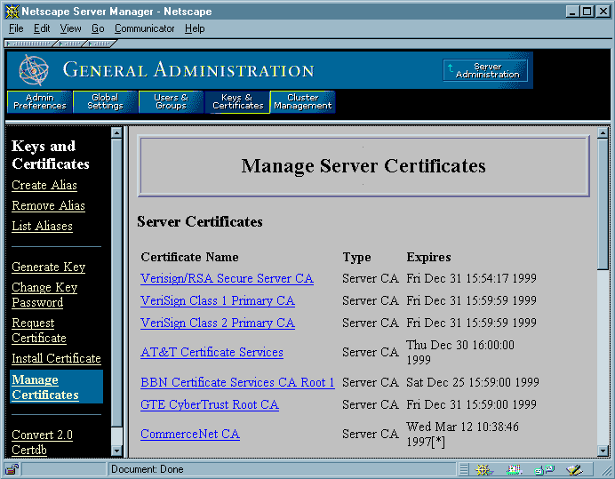 The frame that appears next is shown in Figure 19. It includes all certificates in the server's database, including CA certificates. When you click the name of a certificate listed as a CA, a dialog box appears that allows you to delete the certificate, trust the CA, or not trust the CA.