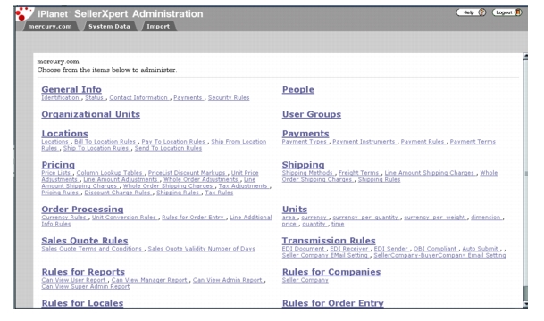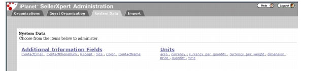 The System Data tab, shown in Figure 3-15, contains links that allow the administrator to configure information for the entire SellerXpert system.