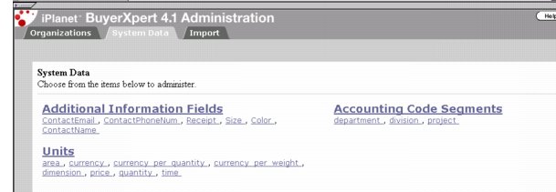 The System Data tab, shown in Figure 3-5, contains links that allow the BuyerXpert administrator to configure information for the entire BuyerXpert system.