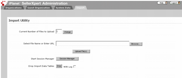 In this screen, the administrator specifies the file(s) to be imported and creates an import session that uploads the data into SellerXpert.