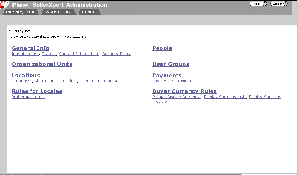 If a superadmin logs into SellerXpert, a screen appears that is similar to the screen shown in Figure 3-3.