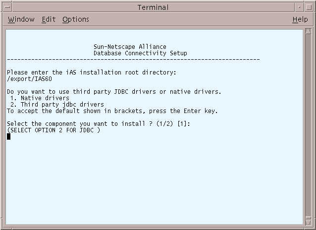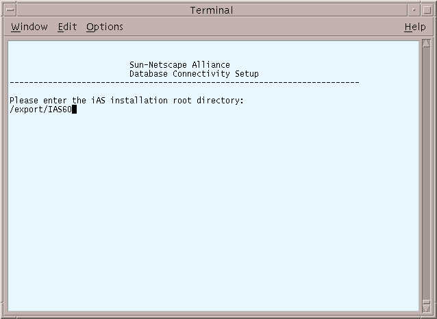 The Database Connectivity Setup prompt displays. Enter the location where iAS is installed (shown as /export/IAS60 in the example).