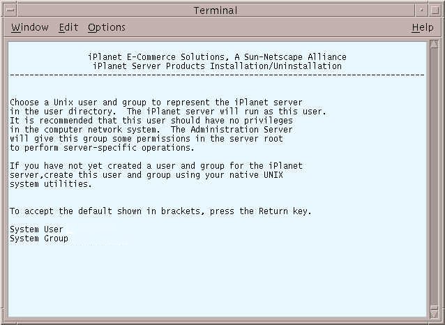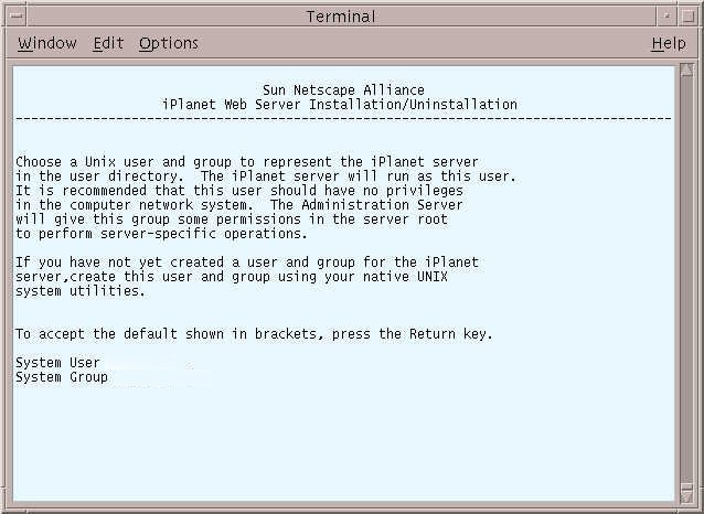 The Choosing a Unix User and Group screens display. The default should be chosen only if you want iWS to use the displayed Unix user and group to run iWS. Press Enter to accept the default or enter a Unix user and group.