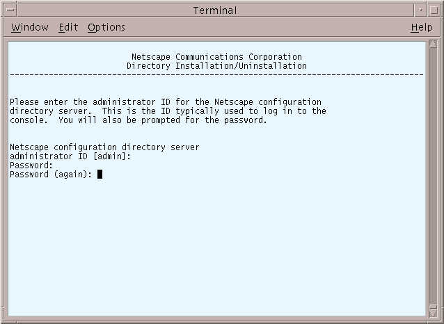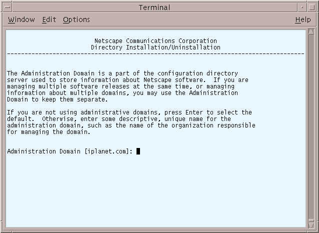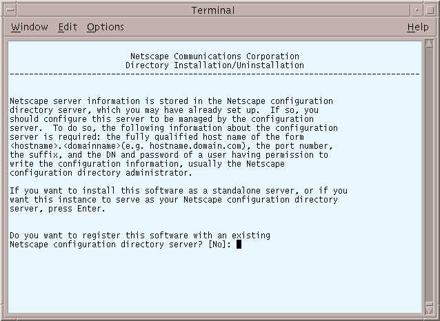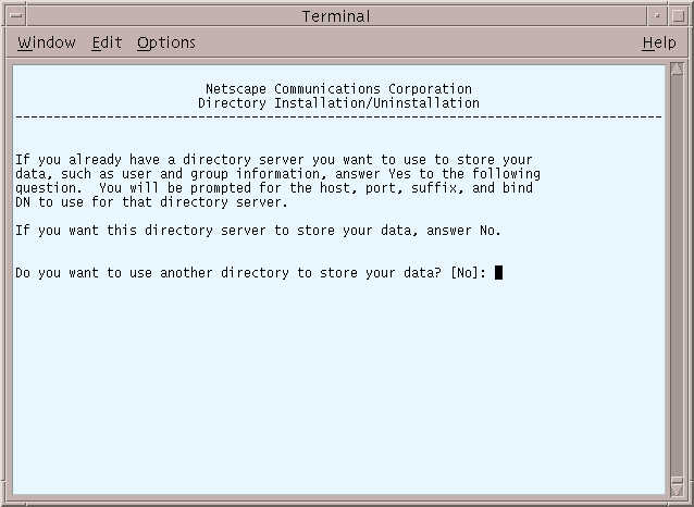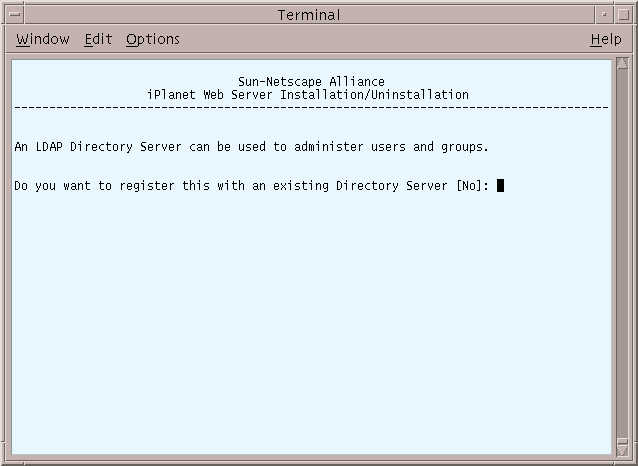 The LDAP Directory Server screen displays. If other iPlanet products have been installed on this network, you can unify the administration of the separate servers by typing Y and entering the necessary information.