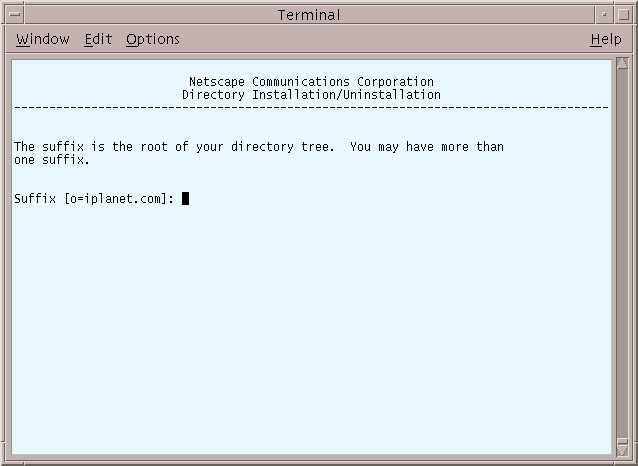 The Directory Tree Suffix screen displays. Enter a suffix for this installation, for example, o=sxinstall.com.