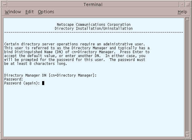 The Directory Manager Distinguished Name (DN) screen displays. Press Enter to accept the default Directory Manager DN, then enter your password and the password again.