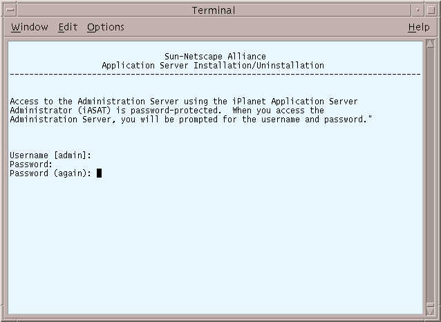 The Administration Server Username and Password screen displays. Enter your administration server username, your password, and the password again.