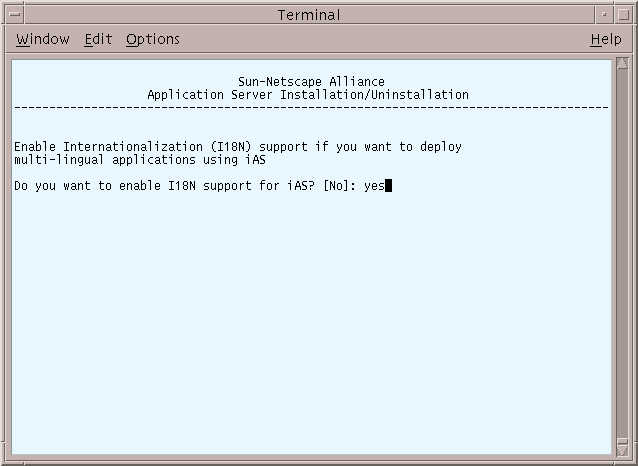 The Enable Internationalization screen displays. Type Yes to enable international support for iAS.