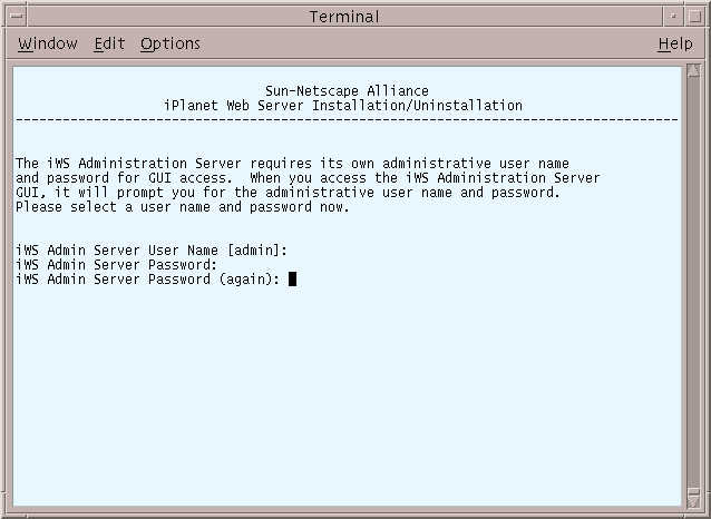 The iWS Administration Server User Name screen displays. Press Enter to accept the default, or enter a new iWS username.