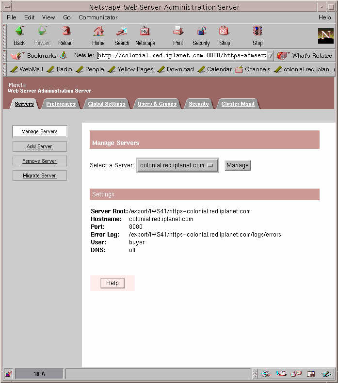 The Manage Server screen displays. Click the server name (located next to Select a Server) and then click Manage.