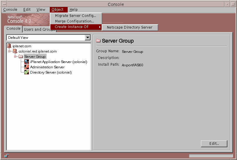 Choose the Server Group, located on the left side of the screen. Click Object, then from the drop-down menu, choose Create Instance of Netscape Directory Server.