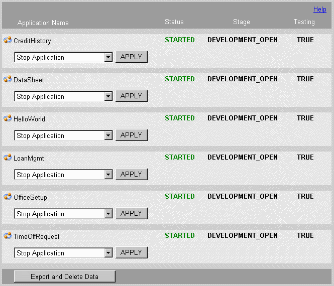 Applications that handle business processes are at the heart of the Process Manager. Process Manager provides several forms for managing applications. You can change an application's state, view its logs, and export and delete its data.