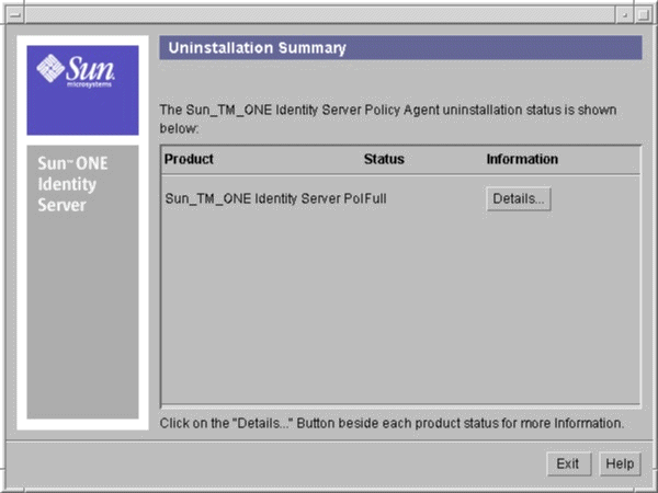 In the Uninstallation Summary window, click Details for a detailed summary of the configuration information that was processed during uninstallation. Click Exit to end the program Figure 2-8    Uninstall Summary Screen ![]()