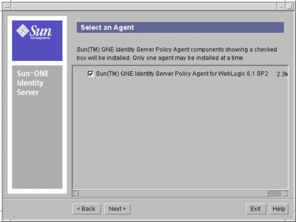 In the Select an Agent screen, select the component you wish to install in this by selecting the check box against the component name. The only component available for installation is the Sun ONE Identity Server Policy Agent for WebLogic Server 6.1 SP2, which is selected by default. Figure 2-1    Component Selection Screen ![]()
