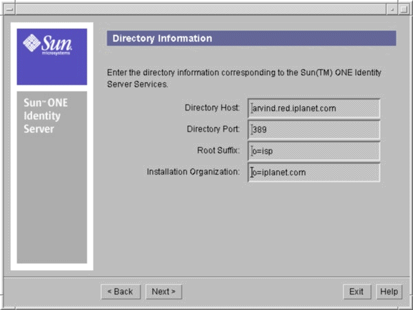 In the Directory Server Information screen, provide the following information about the Directory Server that is associated with Sun ONE Identity Server services. Figure 2-3    Directory Information Screen ![]()