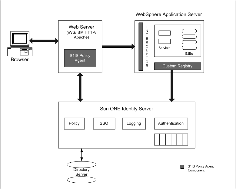 The Identity Server Policy Agent for WebSphere Application Server 4.0.3 is designed to enforce authentication and authorization for clients that interact with the application through the application server's web container. The resources deployed on the WebSphere are protected by a combination of a Web Agent and a J2EE Agent.