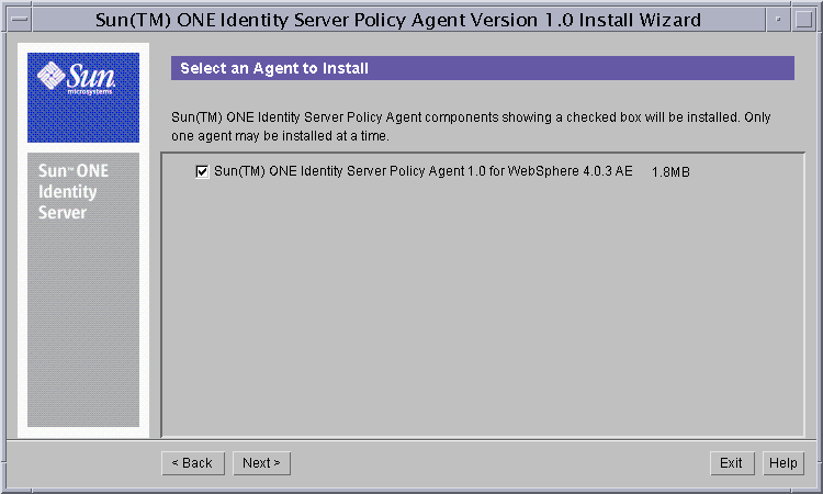 In the Select an Agent screen, select the component you wish to install by selecting the check box against the component name. The only component available for installation is the Identity Server Policy Agent for WebSphere Server 4.0.3, which is selected by default. Figure 3-2    Component Selection Screen ![]()