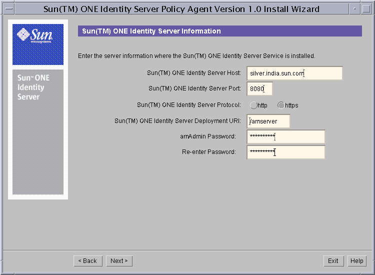Sun ONE Identity Server Host: Enter the fully qualified host name of the system where Sun ONE Identity Server is installed.