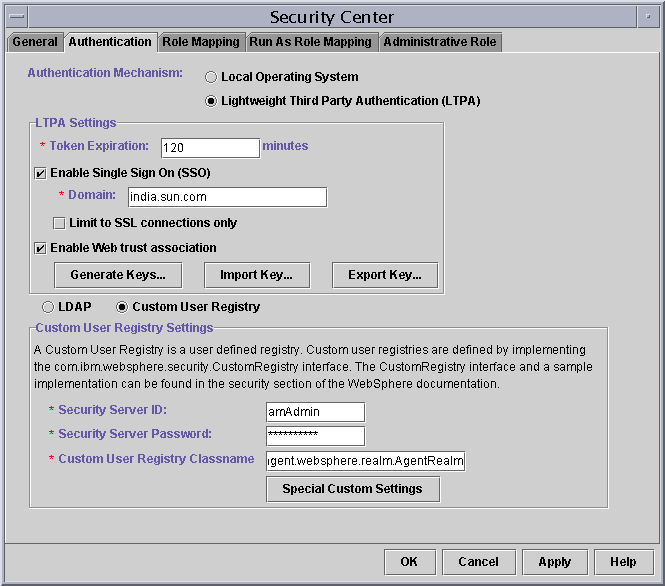 The J2EE role-based authorization is performed by the WebSphere application server. The WebSphere must trust the RPSS before accepting the authentication credentials. For the WebSphere to trust the RPSS, a Web Trust Association (WTA) between WebSphere and RPSS needs to be established. This can be achieved by implementing the Web Trust Association Interceptor (WTAI) for the RPSS. The WTAI implementation establishes the trust by validating SSO Token in the request. On a successful trust validation, the WebSphere runtime uses the WTAI to retrieve principal from the request. The WebSphere runtime uses the identity information obtained from the WTAI to communicate with the user registry. The user registry is the custom registry that communicates with the Identity Server. WebSphere runtime invokes the methods of the user registry to get the set of security identities applicable for the current user. The security identities are used to determine the security roles applicable for the user. This information is used by WebSphere to implement both declarative and programmatic security.