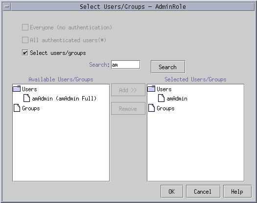 In the Select Users/Groups - AdminRole screen, select the Realm Administrator and click on Remove. Click OK.