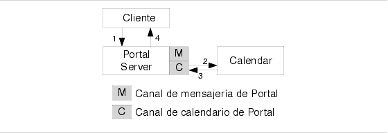 - La l�nea continua muestra c�mo se produce la comunicaci�n del adaptador de SSO y la autenticaci�n del proxy entre los canales de correo y de calendario con sus respectivos servicios de servidor de Messaging Server y Calendar Server.