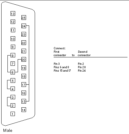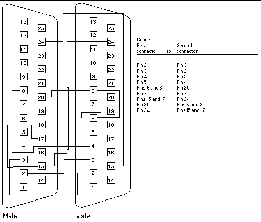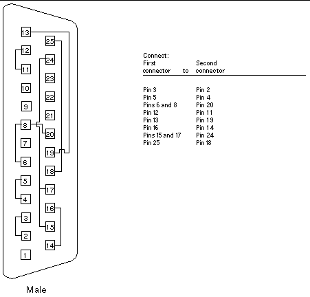 Use these wiring instructions for 25-pin RS-232 and RS-423 port to 25-pin RS 232 and RS 423 port loopback cables (two DB-25 connections). It is plugged into a pair of serial ports in the back of the system under test. Both connectors are male.