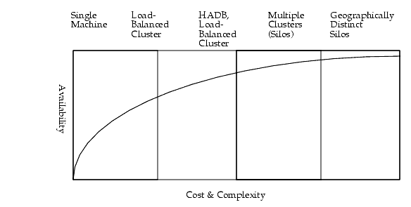 Figure 2-3 illustrates the increasing cost and complexity of mitigating against decreasingly probable events. At one end of the continuum, a simple load-balanced cluster can tolerate localized application, middleware, and hardware failures. At the other end of the scale, geographically distinct clusters can mitigate against major catastrophes affecting the entire data center.