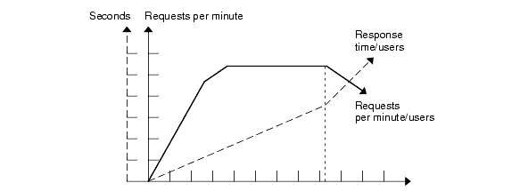 The faster the response time, the more requests per minute are being processed. However, as the number of users on the system increases, the response time starts to increase as well, even though the number of requests per minute declines, as the following diagram illustrates: