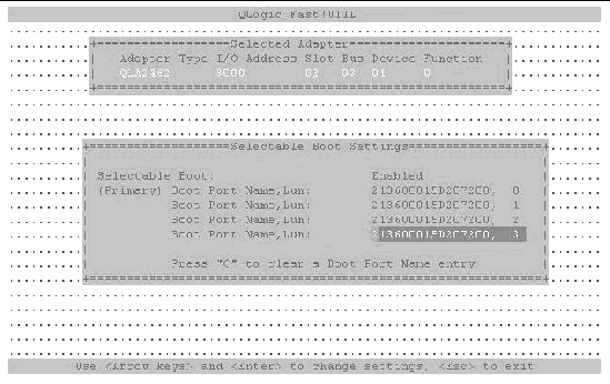 7. During the reboot process, watch the monitor so you can enter the HBA #1 BIOS screen and specify the boot device to be the FC LUN onto which you just installed the Sun Solaris OS. Follow this step for each HBA to be used for multipathing, and specify the boot device to be the FC LUN on which you installed the Sun Solaris OS. See FIGURE 7-4 and FIGURE 7-5.