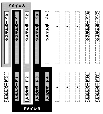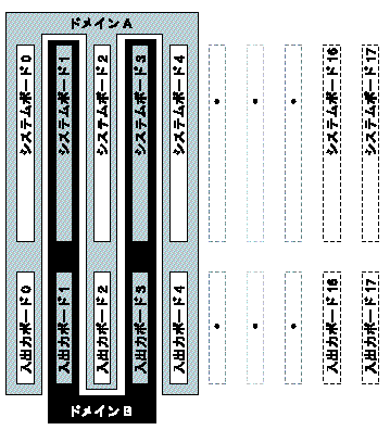 ドメイン A には、システムボード 0 と 2、入出力ボード 2 が含まれています。ドメイン B には、システムボード 1 と 3、および入出力ボード 1 と 3 と 4 が含まれています。