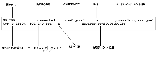 cfgadm プログラムは、ボードとスロットに関する情報を表示します。このコマンドのオプションについては、cfgadm(1) マニュアルページを参照してください。