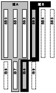 下面的 Sun Fire 系统配置(如下图所示)是系统资源重新配置的一个实例:域 A 包含系统板 0 和 2,以及 I/O 板 7。域 B 包含系统板 1 和 3,以及 I/O 板 8。